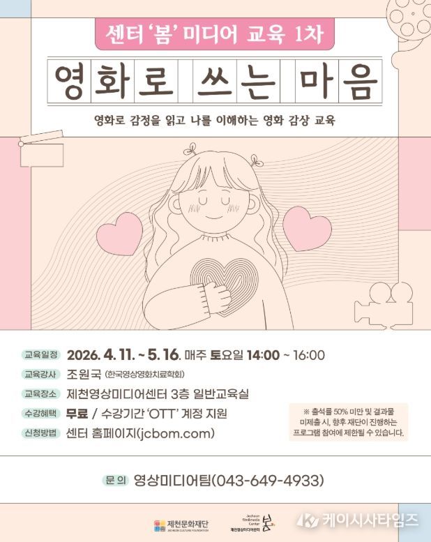 이번 교육은 영화를 매개로 자신의 감정을 돌아보고 타인에 대한 공감 능력을 높이는 프로그램으로, 제천영상미디어센터 3층 일반교육실에서 4월 11일부터 5월 16일까지 매주 토요일 오후 2시, 총 5회차에 걸쳐 진행된다.