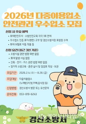(케이시사타임즈) 경산소방서는 다중이용업소 관계인의 자율안전관리 문화 정착과 안전한 영업 환경 조성을 위해 ‘2026년 다중이용업소 안전관리 우수업소’를 선정한다고 밝혔다.