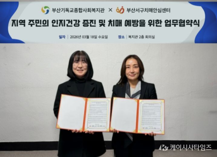 (케이시사타임즈) 부산 서구치매안심센터(센터장 양태인)는 지난 18일 부산기독교종합사회복지관(관장 김정자)과 치매 예방 및 인지건강 증진을 위한 업무협약(MOU)을 체결했다.