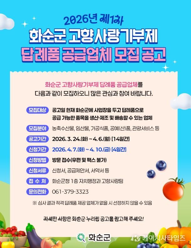 (케이시사타임즈) 화순군은 24일 고향사랑기부제 활성화와 기부자 만족도 제고를 위해 2026년 제1차 고향사랑기부제 답례품 및 공급업체를 모집한다고 밝혔다.