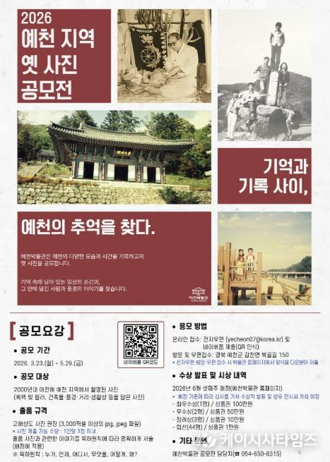 (케이시사타임즈) 예천박물관은 지역의 역사와 생활상을 담은 기록을 수집·공유하기 위한 ‘2026 예천 지역 옛 사진 공모전 – 기억과 기록 사이, 예천의 추억을 찾다’ 공모전을 5월 29일까지 개최한다.