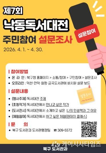 (케이시사타임즈) 부산 북구는 오는 4월 1일부터 30일까지 한 달간 2026년 제7회 낙동독서대전 개최를 위한 구민 의견수렴 설문조사를 실시한다고 밝혔다.