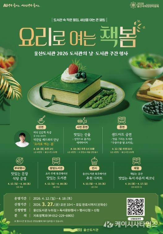 울산도서관 관계자는 “도서관의 날과 도서관 주간을 기념해 시민들이 도서관을 통해 새로운 문화를 즐기면서 건강한 맛도 챙기는 다양한 프로그램을 준비했다”라며, “울산도서관에서는 요리를 주제로 한 인문학적 즐거움을, 울산어린이청소년도서관에서는 반려동물을 통해 생명 존중과 공감의 가치를 배우며 스스로 성장하는 계기가 되길 바란다”라고 말했다.