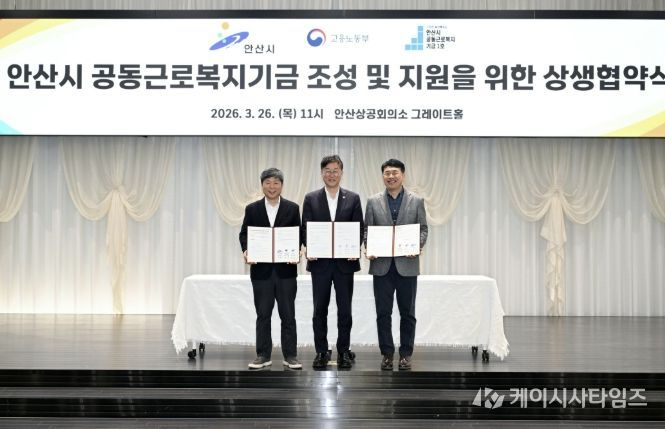 (케이시사타임즈) 안산시는 지난 26일 안산상공회의소 그레이트홀에서 경기지방고용노동청 안산지청, 안산시 공동근로복지기금 1호 법인과 함께 ‘안산시 공동근로복지기금 조성 및 지원을 위한 상생협약’을 체결했다고 27일 밝혔다.