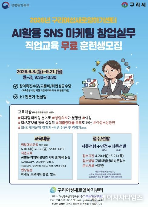 (케이시사타임즈) 구리시는 구리새일센터에서 여성들의 디지털 마케팅 역량을 강화하고 성공적인 취·창업을 지원하기 위해 ‘AI 활용 SNS 마케팅 창업 실무’ 직업교육훈련 과정의 교육생을 오는 4월 20일부터 모집한다고 밝혔다.