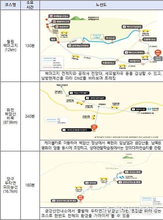 각 코스는 ▲6.25전쟁 당시 국군과 중공군 간 공방전 끝에 국군이 탈환한 ‘철원 백마고지 코스’, ▲가곡 ‘비목’의 배경으로 알려져 있으며, 케이블카로 오를 수 있는 ‘화천 백암산 비목 코스’, ▲전쟁 속에서도 자연의 모습을 간직한 ‘양구 두타연 피의능선 코스’, ▲백두대간의 아름다운 풍경을 바라보는 ‘인제 대곡리초소~1052고지 코스’, ▲동해안을 따라 이어지는 해금강과 금강산을 함께 조망하는 ‘고성 통일전망대․금강산전망대 코스’로 구성된다.