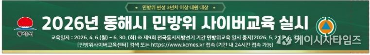(케이시사타임즈) 동해시는 민방위 대원의 교육 편의성을 높이고 재난 대응 역량을 강화하기 위해 오는 4월 6일부터 6월 30일까지 상반기 민방위 사이버 교육을 실시한다고 밝혔다.