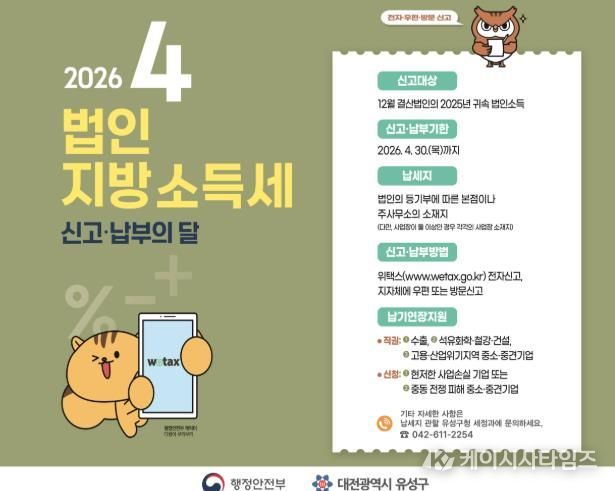 (케이시사타임즈) 대전 유성구는 오는 30일까지 2025년 귀속 법인지방소득세 신고납부 기간을 운영한다.