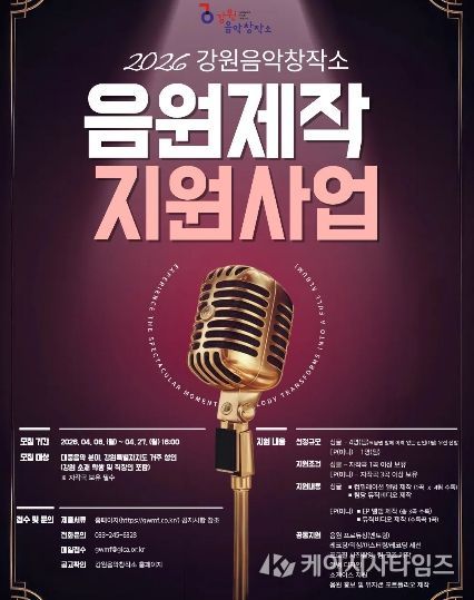 (케이시사타임즈) 강원음악창작소가 오는 27일까지 도내 역량 있는 뮤지션을 발굴하기 위해 ‘2026년 음원제작 지원사업’의 참여자를 모집한다.