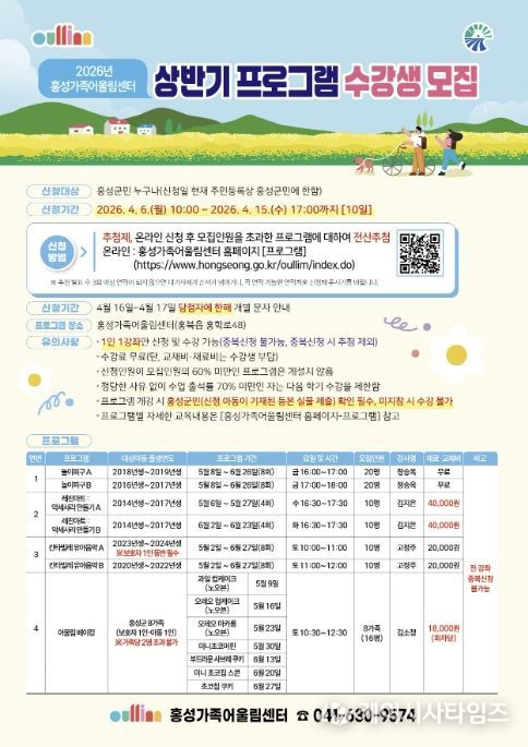 모집 기간은 2026년 4월 6일 10시부터 4월 15일 17시까지로, 접수 방법은 홍성가족어울림센터 홈페이지에서 온라인 접수로만 가능하다.