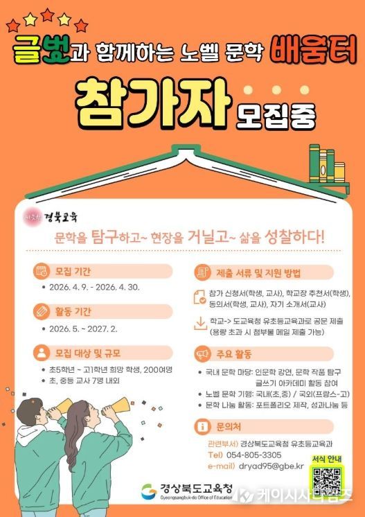 임종식 교육감은 “글벗과 함께하는 노벨 문학 배움터는 학생과 교사가 서로의 글벗이 되어 문학을 깊이 탐구하고 생각을 글로 표현하며 함께 성장하는 배움의 장”이라며, “이번 사업이 경북 독서·인문교육을 한 단계 도약시키는 계기가 될 수 있도록 적극 지원하겠다”라고 말했다.