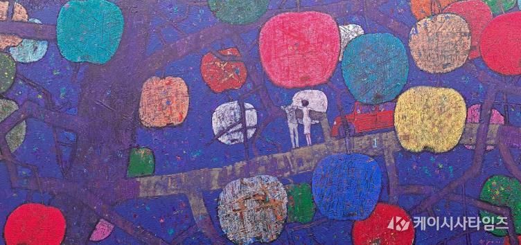 화면 속 채색은 사과의 외형을 재현하기보다 그 안에 응축된 기운을 드러내며, 존재의 본질에 대한 사유를 회화적 장으로 펼쳐낸다.
