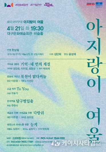 (케이시사타임즈) 대구시립국악단 화요국악무대 '아지랑이 여울' 공연이 4월 21일 저녁 7시 30분 대구문화예술회관 비슬홀에서 펼쳐진다.