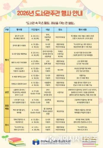 (케이시사타임즈) 경상북도교육청 청송도서관이 2026년 4월 도서관주간을 맞이하여 ‘도서관 속 작은 펼침, 세상을 여는 큰 열림’을 주제로 다양한 독서·문화 프로그램을 운영한다.