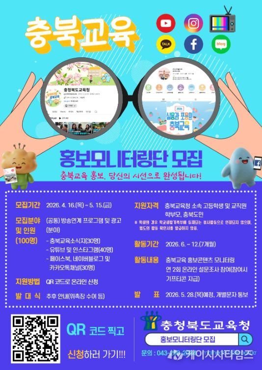(케이시사타임즈) 충청북도교육청은 16일부터 5월 15일까지 교육가족과 도민의 다양한 의견을 반영한 홍보를 강화하기 위해 '2026. 충북교육 홍보 모니터링단'을 모집한다.