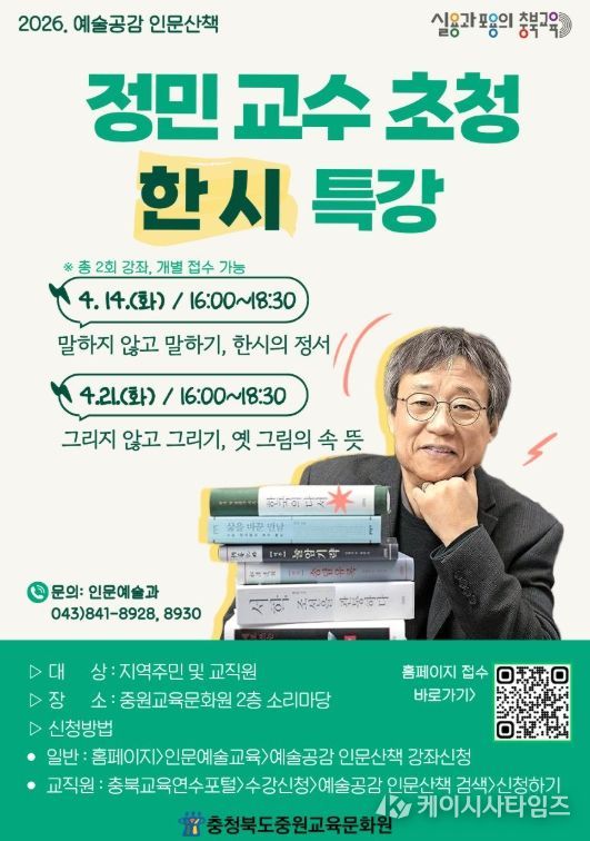 신기철 중원교육문화원장은 “예술과 인문을 아우르는 강연을 통해 지역 주민들이 삶을 깊이 성찰하고 문화적 안목을 넓히는 계기가 되길 바란다.”라며 “앞으로도 다양한 분야를 아우르는 인문‧예술 프로그램을 지속적으로 운영하겠다.”라고 밝혔다.
