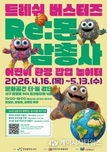 (케이시사타임즈) (재)인천서구문화재단은 오는 4월 16일부터 5월 13일까지 문화공간 터·틀(검단)에서 어린이 환경 체험 전시 ‘트레쉬 버스터즈: Re:몬 삼총사 - 어린이 환경 팝업 놀이터’를 개최한다.