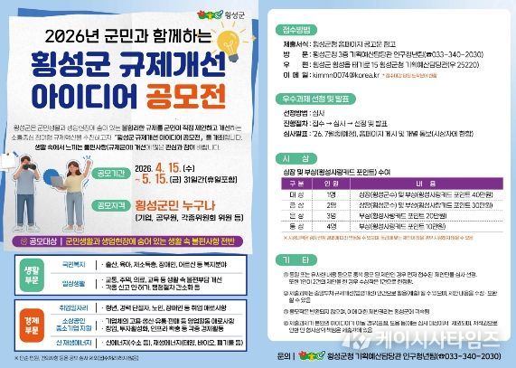 (케이시사타임즈) 횡성군이 군민의 일상생활과 생업현장에서 겪고 있는 각종 불합리한 규제를 개선하기 위해 ‘2026년 횡성군 규제개선 아이디어 공모전’을 개최한다.