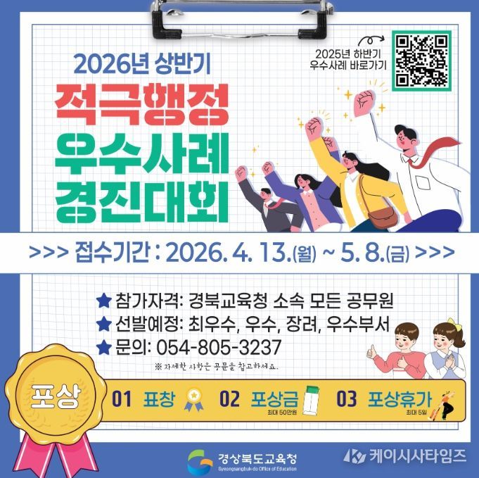 (케이시사타임즈) 경북교육청은 능동적이고 창의적인 공직문화를 조성하고 교육 현장의 변화를 이끈 우수 사례를 발굴하기 위해 ‘2026년 상반기 적극행정 우수 사례 경진대회’를 개최한다고 15일 밝혔다.