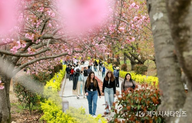 (케이시사타임즈) 경주 불국사공원 겹벚꽃이 만개를 앞두고 분홍빛 물결을 이루며 상춘객들의 발길을 끌고 있다.