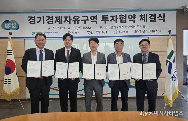 (케이시사타임즈) 경기경제자유구역청은 15일 경기경제청 8층 회의실에서 평택시 및 자동차부품, 반도체, 화학 제조기업 5개사(㈜왕성이노텍, 조양메탈㈜, ㈜광석인터내셔날/그 외 2개 기업 서면 협약)와 평택 포승(BIX)지구 산업시설용지 투자협약을 체결했다.