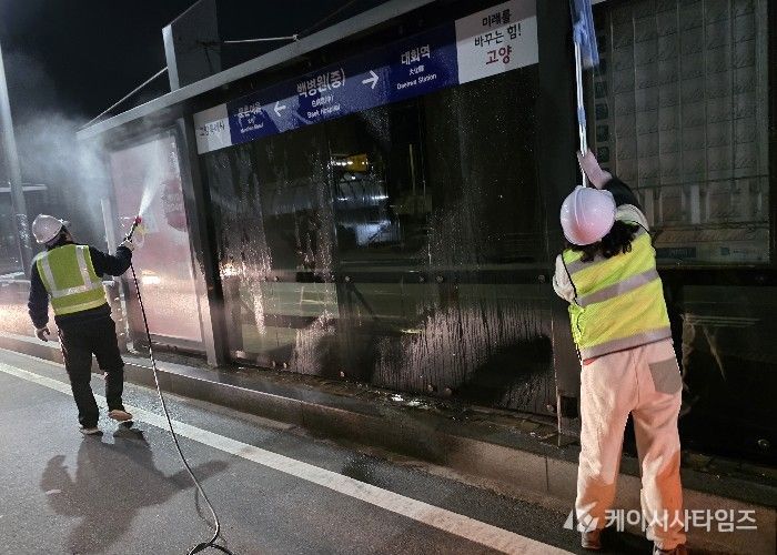 (케이시사타임즈) 고양특례시 일산서구는 오는 24일 개최되는 ‘2026고양국제꽃박람회’에 대비해 방문객과 시민들에게 쾌적한 교통 환경을 제공하기 위해 지난 15일 새벽 중앙로 간선급행버스체계(BRT) 승강장에 대한 고압 물세척을 완료했다.