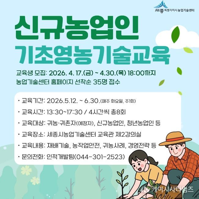 (케이시사타임즈) 세종특별자치시 농업기술센터가 귀농·귀촌자 및 신규농업인을 대상으로 신규농업인 기초영농기술교육 1기 교육생을 선착순 모집한다고 17일 밝혔다.