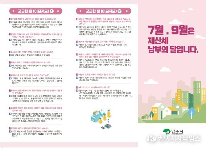 (케이시사타임즈) 영주시는 2026년 7월 정기분 재산세 부과를 앞두고 시민들의 세금 납부 이해도를 높이고 편의를 제공하기 위해 재산세 안내 리플릿을 제작·배부한다.