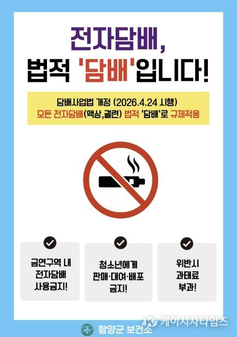 (케이시사타임즈) 함양군 보건소는 전자담배를 포함한 모든 담배 제품의 금연구역 내 사용을 규제하는 '담배사업법' 개정에 따라 오는 4월 24일부터 5월 15일까지 집중 점검을 실시한다고 밝혔다.