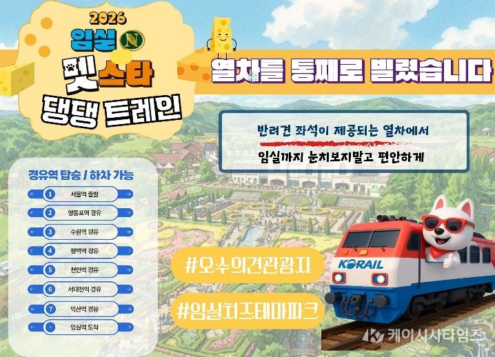(케이시사타임즈) 임실군이 오는 5월 1일부터 3일까지 3일간 개최되는 ‘2026 임실N펫스타’를 앞두고, 반려견과 함께 떠나는 특별 전용 열차 상품인 ‘임실N펫스타 댕댕트레인’을 운영한다고 밝혔다.