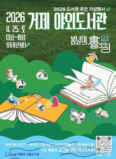 (케이시사타임즈) 거제시 시립도서관은 4월 도서관 주간을 맞아 오는 4월 25일 상동동 용산쉼터에서 시민 참여형 야외 독서문화 행사인 2026 거제 야외도서관 『봄날의 書(서)핑』을 개최한다.