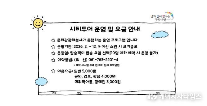 한편, 광양시티투어는 산업관광 코스를 비롯해 야경·힐링·역사 등 다양한 테마로 운영되며, 자세한 사항은 광양시 문화관광 누리집 ‘여행준비’의 ‘시티투어’ 코너에서 확인할 수 있다.