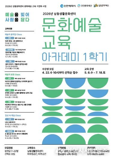 (케이시사타임즈) 인천시 남동문화재단은 오늘 5월 6일부터 7월 18일까지 남동생활문화센터에서 ‘2026년 남동생활문화센터 문화예술 교육 아카데미 1학기’를 운영한다고 17일 전했다.