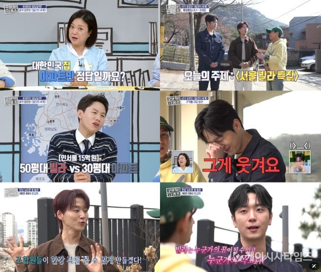 이날 방송은 서울 곳곳의 ‘빌라’를 임장하는 ‘빌라의 모든 것’ 특집으로 꾸며졌다. 한국에서 통상적으로 다세대·다가구·연립주택 등 저층 공동주택을 일컫는 ‘빌라’를 중심으로 다양한 매물들이 소개된 가운데, 4월 컴백을 앞둔 포레스텔라 조민규와 고우림이 게스트로 출연해 MC 양세형과 호흡을 맞췄다. 특히 평창동 자취 경험이 있는 부동산 관심러 조민규와 ‘홈즈’에 출연했던 임장 선배 고우림, 그리고 양세형의 케미가 색다른 재미를 더했다.