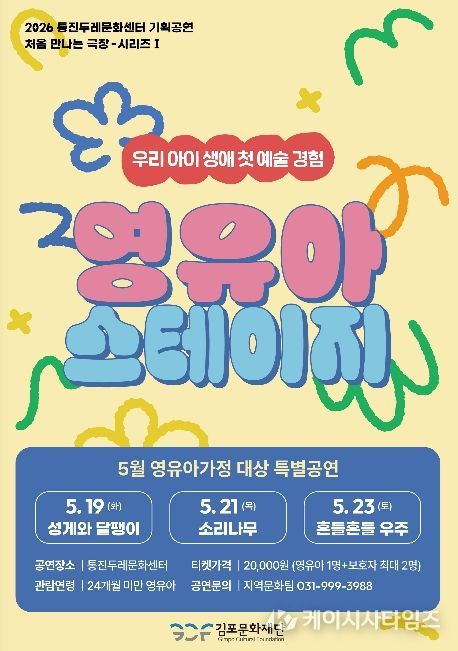(케이시사타임즈) 김포문화재단은 오는 5월 가정의 달을 맞아 통진두레문화센터 특별 기획으로 24개월 미만 영유아를 위한 체험형 공연 시리즈 '처음 만나는 극장 - 영유아 스테이지'를 선보인다.