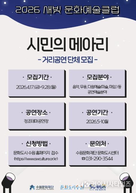 (케이시사타임즈) 수원문화재단은 지역 공연예술의 활성화와 수원시민의 주체적 문화예술 참여를 위해 ‘새빛 문화예술클럽 '시민의 메아리'’ 사업에 참여할 생활예술단체를 모집한다.