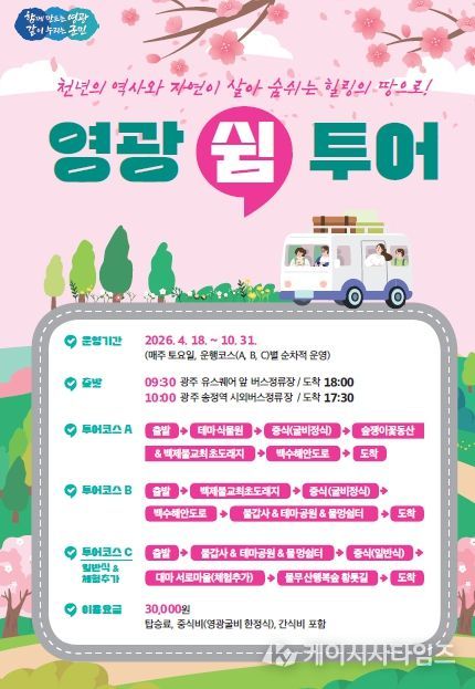 (케이시사타임즈) 영광군은 4월 18일부터 10월 31일까지(7∼8월 폭염으로 제외) 토요 감성 힐링 여행‘2026년 영광 쉼 투어’를 매주 토요일 운영 한다고 밝혔다.