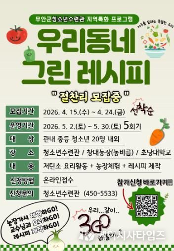 무안군청소년수련관은 ‘우리동네 그린레시피’ 프로그램 참가자를 오는 4월 24일까지 모집한다고 밝혔다.