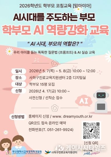 (케이시사타임즈) 사하구진로교육지원센터는 오는 5월 7일부터 5월 8일까지 양일간 학부모를 대상으로 'AI 시대, 부모의 역할은?' 특강을 운영한다.