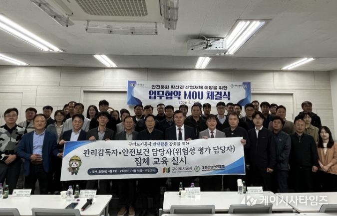 (케이시사타임즈) 구미도시공사는 대한산업안전협회와 산업현장 안전문화 확산 및 근로자 산업재해 예방을 위한 업무협약(MOU)을 체결하고, 안전 중심의 경영체계 구축을 위한 협력에 나섰다.