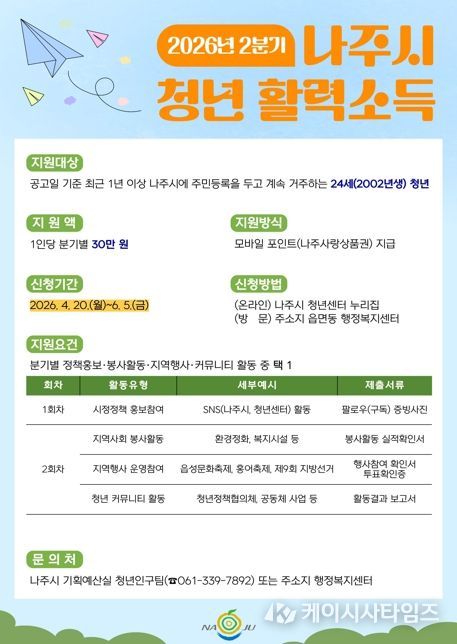 (케이시사타임즈) 전남 나주시가 지역 청년의 사회참여 확대와 안정적 정착을 지원하기 위해 공공활동 참여를 조건으로 분기별 30만 원을 지급하는 ‘청년 활력소득 지원사업’ 2분기 참여자 모집에 나선다.