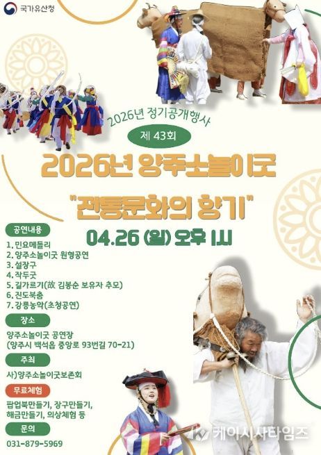 (케이시사타임즈) 양주시는 국가유산청의 지원을 받아 ‘제43회 양주소놀이굿 정기공개행사’를 오는 26일 오후 1시, 양주소놀이굿 전수교육관 공연장에서 개최한다고 밝혔다.