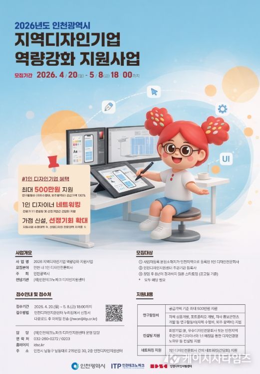 (케이시사타임즈) 인천테크노파크(인천TP)는 오는 5월 8일까지 지역 디자인 산업의 경쟁력 강화를 위한 ‘2026 지역디자인기업 역량강화 지원사업’에 참여할 1인 디자인기업을 모집한다고 밝혔다.