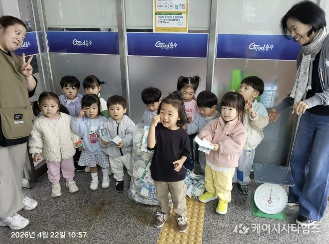 (케이시사타임즈) 충주시 대소원면 소재 코아키즈어린이집 원생들이 22일 자원 재순환의 가치를 실천하기 위해 대소원면행정복지센터를 방문했다.