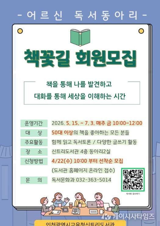 (케이시사타임즈) 인천광역시교육청신트리도서관은 어르신의 정서 안정과 삶의 질 향상을 지원하고 지역사회 독서문화 활성화를 위해 독서동아리 ‘책꽃길’을 운영한다.