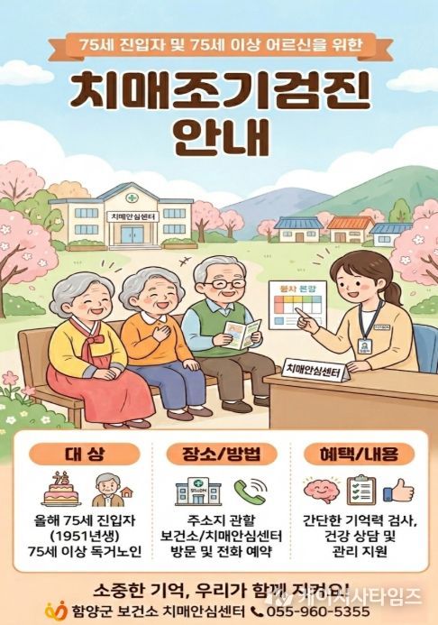 (케이시사타임즈) 함양군 치매안심센터는 고령 주민의 건강한 일상 유지를 위해 75세 진입자와 75세 이상 독거노인을 대상으로 치매 조기 검진을 적극적으로 권고하고 있다고 밝혔다.
