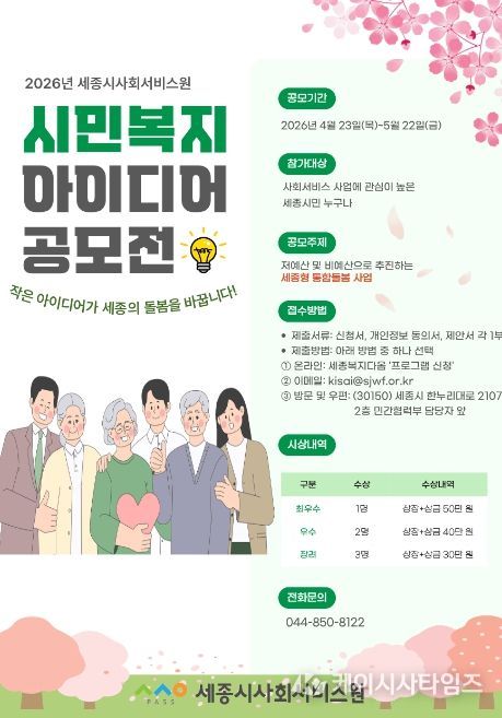 (케이시사타임즈) 세종시사회서비스원은 시민의 일상 속 경험과 참신한 제안을 바탕으로 지역 복지 문제를 함께 해결하기 위해 ‘2026년 시민복지 아이디어 공모전’을 개최한다고 밝혔다.