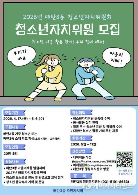 (케이시사타임즈) 수원시 영통구 매탄3동은 매탄3동 주민자치회가 지역 청소년의 참여를 확대하고, 향후 지역사회를 이끌어 나갈 역량을 기르기 위해 2026년 청소년자치위원회 위원을 모집한다고 밝혔다.