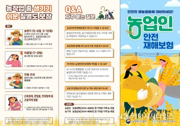 농업인 안전보험은 농작업 중 발생하는 재해와 질병을 보장한다. 온열질환, 쯔쯔가무시병, 중증열성혈소판감소증후군, 근골격계 질환 등이 보장 대상에 포함되며, 사망·장해와 상해·질병 치료도 상품별 기준에 따라 지원된다.