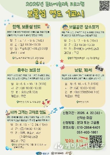 (케이시사타임즈) 부산시 영도구는 지역 자원을 활용한 영도형 문화예술교육 프로그램인 ‘보물섬영도 1교시’ 참여자를 오는 5월부터 본격 운영한다.
